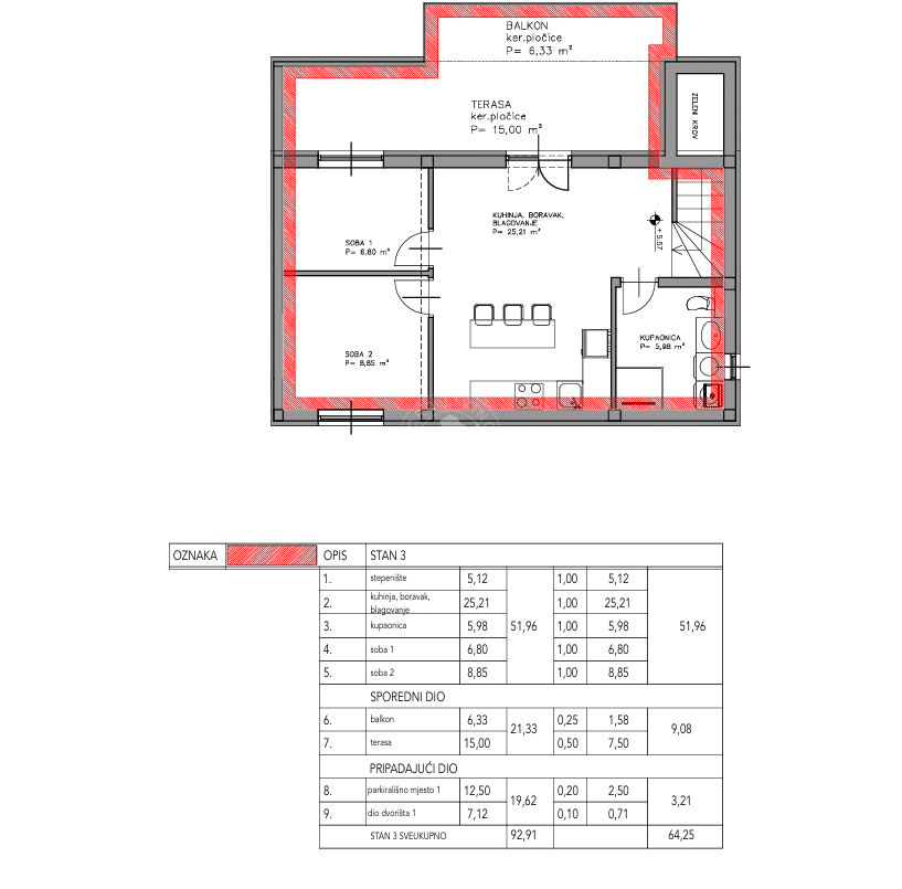 Na prodaju ugodan dvoetažni stan brutto površine 92,91 m2 => NKP 64,25 m2, smješten u manjoj stambenoj zgradi s ukupno dva kata. Stan zauzima prvi i drugi kat, pri čemu prva etaža služi kao ulazni hodnik s pristupom stepenicama koje vode do glavnog stambenog prostora na drugoj etaži.