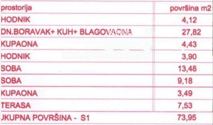 Ukupna površina stana iznosi 74 m², a raspored je funkcionalan i idealan za obiteljski život ili odmor. Stan 2+1, sastoji se od dvije spavaće sobe, dvije moderno uređene kupaonice, prostranog dnevnog boravka s kuhinjom i blagovaonicom te praktičnog spremišta smještenog odmah pored stana.