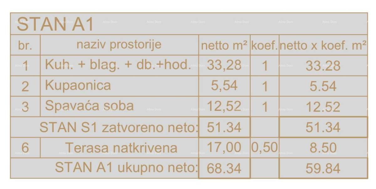 Stan A1, površine od 68.34 m2 (neto površine 59.84 m2) nalazi se u prizemlju zgrade A i sastoji od: dnevnog boravka s kuhinjom i blagavaonom, 1 spavaće sobe, 2 kupaone, natkrivene terase i vrta od 130.86 m2 (neto13.8 m2).