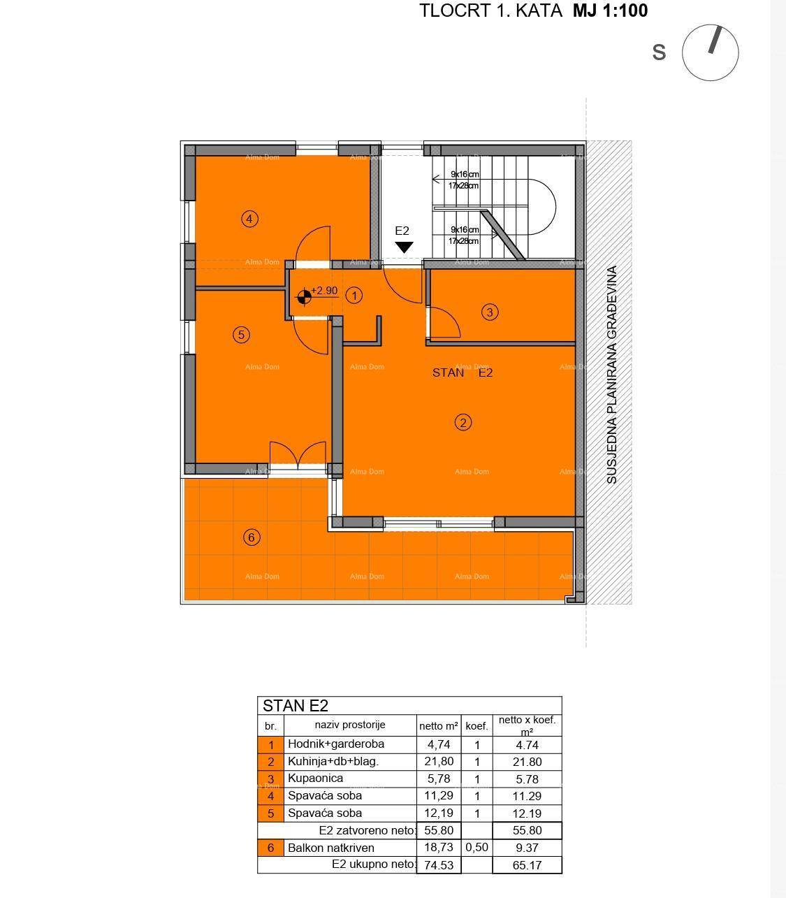 Stan E-2 površine 74.53m2 (reducirane površine 65.78 m2), sastoji se od hodnika+garderoba, kuhinje s blagavaonomi dnevnim boravkom, dvije spavaće sobe, kupaone i natkrivenog balkona.