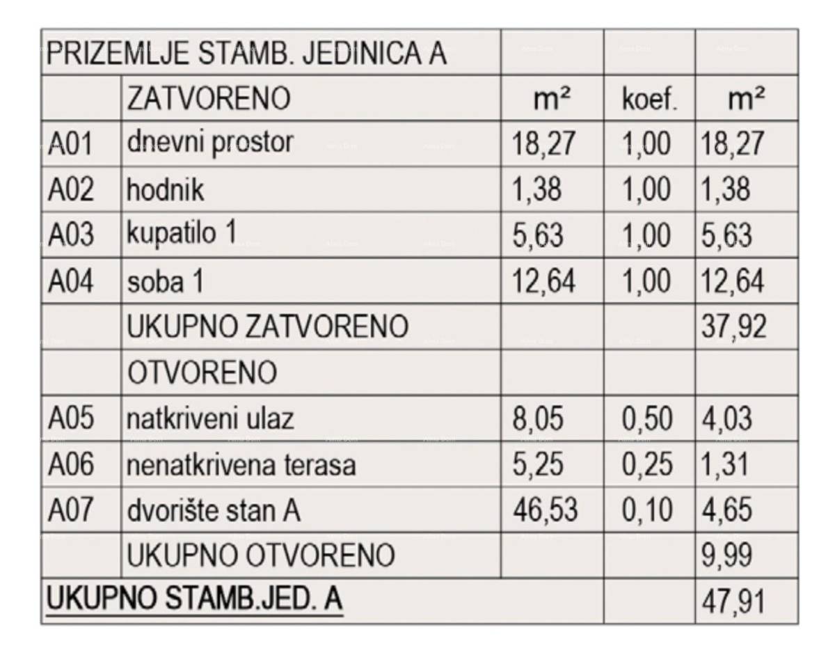 Stan A, nalazi se u prizemlju zgrade A i sastoji od: natkrivenog ulaza, dnevnog prostora s kuhinjom i blagavaonom, spavaće sobe, kupaone, hodnika, nenatkrivene terase i dvorišta.
