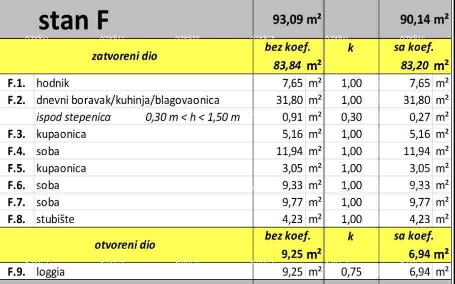 Na 2.katu stan površine 93.09 m2 (neto korisne površine 90.14 m2) sastoji se od hodnika, ostave, dnevnog boravka sa kuhinjom i blagovaonicom, 2 kupaone, 3 spavaće sobe i loggia-e 9.25 m2.