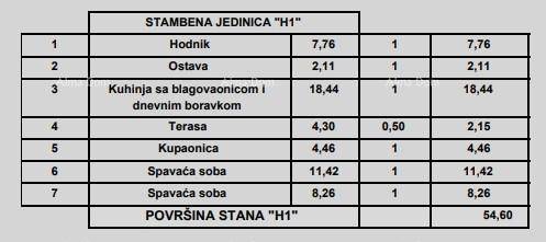 Stan H1, sastoji se od ulaznog hodnika, dnevnog boravka s kuhinjom i blagovaonom, 2 spavaće sobe, kupaone, ostave i terase.