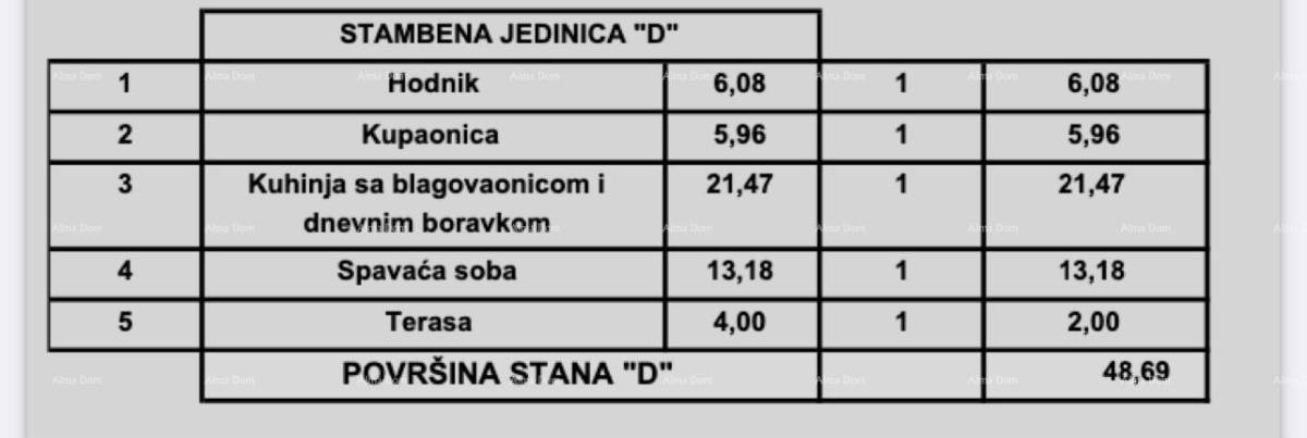 Stan D, sastoji se od ulaznog hodnika, dnevnog boravka s kuhinjom i blagavaonom, spavaće sobe, kupaone i terase.