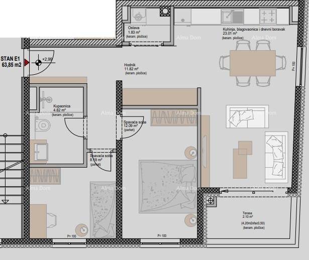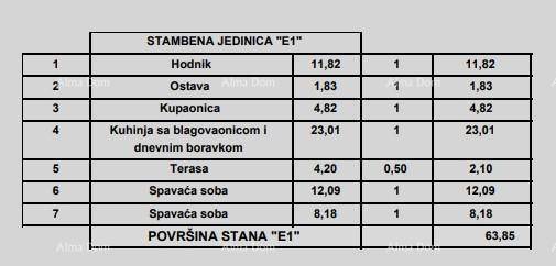 Stan E1, sastoji se od ulaznog hodnika, dnevnog boravka s kuhinjom i blagavaonom, 2 spavaće sobe, kupaone, ostave i terase.