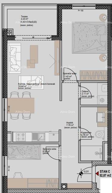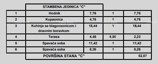 Stan C, sastoji se od ulaznog hodnika, dnevnog boravka s kuhinjom i blagavaonom, 2 spavaće sobe, kupaone i terase.