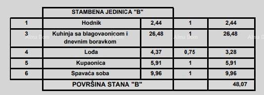 Stan B, sastoji se od ulaznog hodnika, dnevnog boravka s kuhinjom i blagavaonom, spavaće sobe, kupaone i lođe.