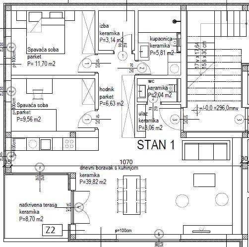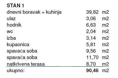 Stan A1, 90.46 m2, nalazi se u prizemlju zgrade i sastoji se od sljedećih prostorija: dnevni boravak + kuhinja, hodnik, izba, wc, kupaonica, dvije sobe, natkrivena terasa.