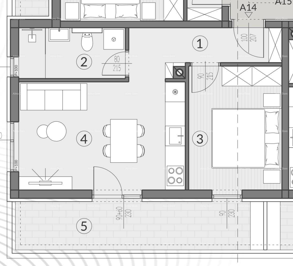 Stan A14, nalazi se na 2.katu zgrade i sastoji se od: hodnik+garderoba, dnevni boravak sa kuhinjom i blagovaonicom, 1 spavaće sobe, kupaonice i natkrivene terase. Stanu pripada jedno parkirno mjesto PM7 od 3,12 m2.