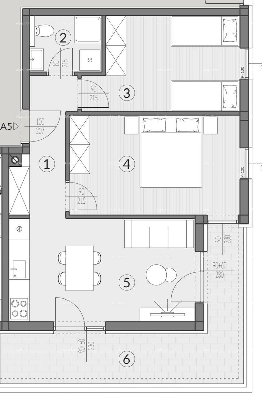 Stan A5, nalazi se u prizemlju zgrade i sastoji se od: hodnik+garderoba, dnevni boravak sa kuhinjom i blagovaonicom, 2. spavaće sobe, kupatila i natkrivene terase. Stanu pripada dva parkirna mjesta od 13,12 m2.