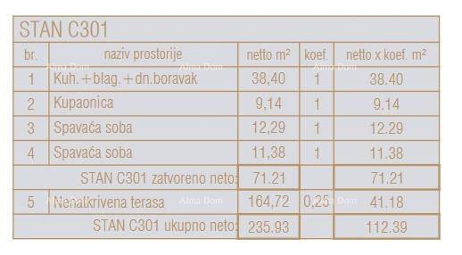 Stan C301 je površine 253.93 m² (neto površina 112.39 m²) i nalazi se na 3. katu centralne jedinice. Sastoji se od: