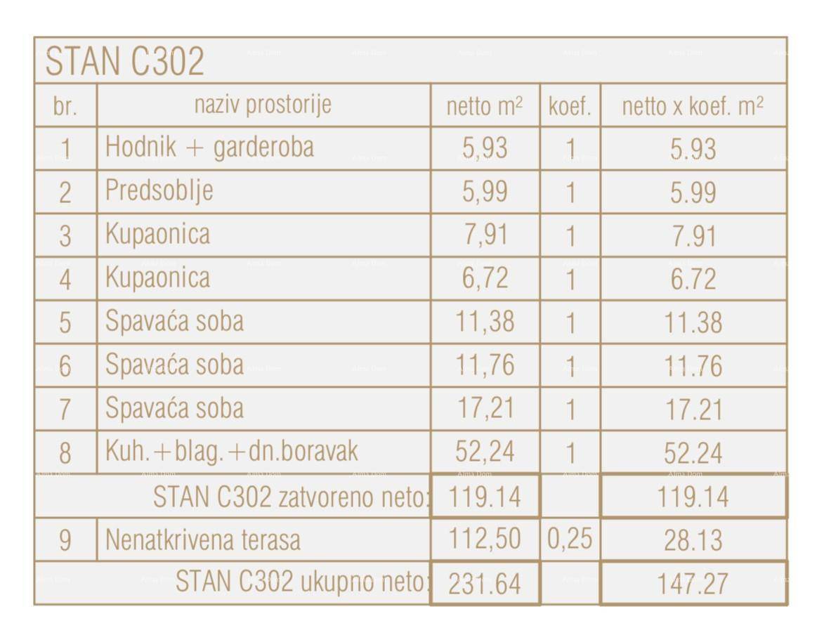 Stan C302, površine 231.64 m2 ( neto147.27 m2) nalazi se na 3.katu centralne jedinice zgrade i sastoji se od: