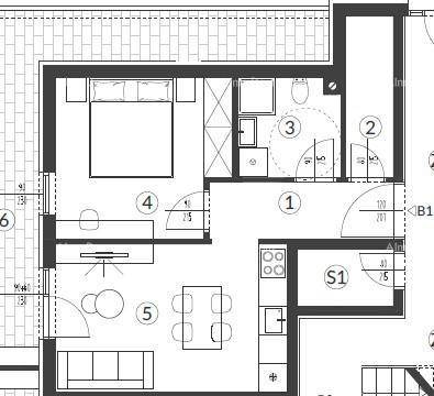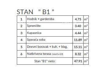 Stan , nalazi se u prizemlju zgrade i sastoji se od: hodnika+ garderoba, spremišta, dnevnog boravka sa kuhinjom i blagovaonicom, spavaće sobe, kupatila i natkrivene terase.