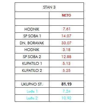 Stan 3, površina 94,81 m2 nalazi se na 1. katu zgrade i sastoji se od hodnika, kuhinje i dnevnog boravka, 2 spavaće sobe i 2 kupaonice. Stan ima lođe 7,24 m2 i 10,92 m2.