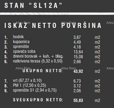 Stan oznake 12A, unutarnje površine 43.92m2, nalazi se u prizemlju zgrade i sastoji se od: hodnika, dnevnog boravka s kuhinjom i blagovaonom, spavaće sobe, kupaone, spremišta, terase i vrta.