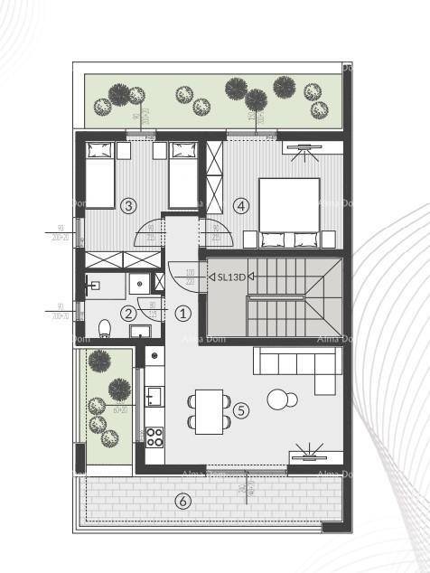 Stan oznake 13D nalazi se na 2.katu zgrade i sastoji se od: hodnika, dnevnog boravka s kuhinjom i blagovaonom, 2 spavaće sobe, kupaone i terase.