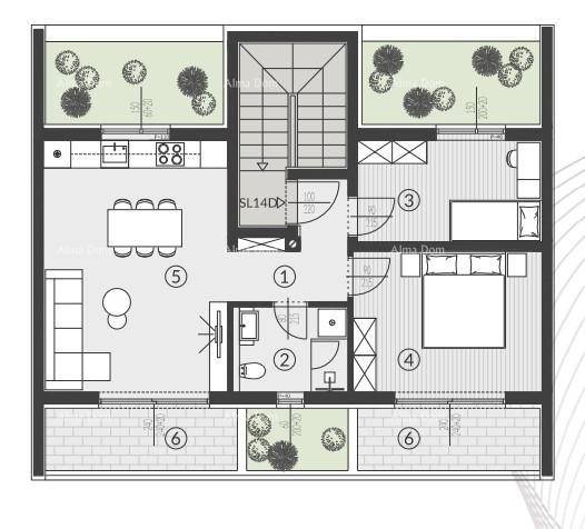 Stan oznake 14D nalazi se na 2.katu zgrade i sastoji se od: hodnika, dnevnog boravka s kuhinjom i blagovaonom, 2 spavaće sobe, kupaone i terase.