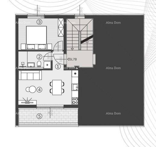 Stan oznake 7B nalazi se na 1.katu zgrade i sastoji se od: hodnika, dnevnog boravka s kuhinjom i blagovaonom, spavaće sobe, kupaone i lođe.