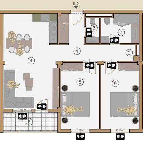 Stan II-2, nalazi se na 2. katu zgrade, ukupne kvadrature 80.16 m2 (netto78,77 m2), a sastoji se od: hodnika, kuhinje, dnevnog boravka i blagovaonice, ostave, 2 spavaće sobe, toaleta, kupaonice i lođe. Grijanje/hlađenje stana će biti osigurano uz klima uređaje Mitsubishi i podno grijanje.