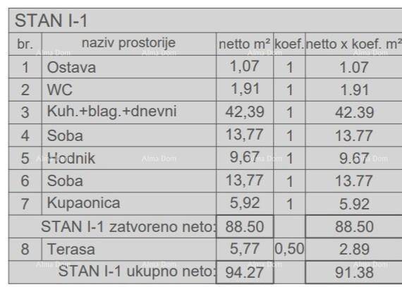 Stan l1, nalazi se na 1. katu zgrade, ukupne kvadrature 91,38m2, a sastoji se od: hodnika, kuhinje, dnevnog boravka i blagovaonice, ostave, 2 spavaće sobe, toaleta, kupaonice i terase. Grijanje/hlađenje stana će biti osigurano uz klima uređaje Mitsubishi i podno grijanje.