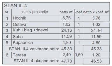 Stan III-4, nalazi se na 3. katu zgrade, ukupne kvadrature 47.73 (netto 46.53 m2), a sastoji se od: hodnika, kuhinje, dnevnog boravka i blagovaonice, ostave, 1 spavaće sobe, kupaonice i terase. Grijanje/hlađenje stana će biti osigurano uz klima uređaje Mitsubishi i podno grijanje.