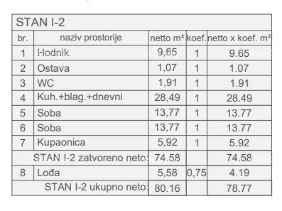 Stan I-2, nalazi se na 1. katu zgrade, ukupne kvadrature 80.16 m2 (netto 78,77 m2), a sastoji se od: hodnika, kuhinje, dnevnog boravka i blagovaonice, ostave, 2 spavaće sobe, toaleta, kupaonice i lođe. Grijanje/hlađenje stana će biti osigurano uz klima uređaje Mitsubishi i podno grijanje.