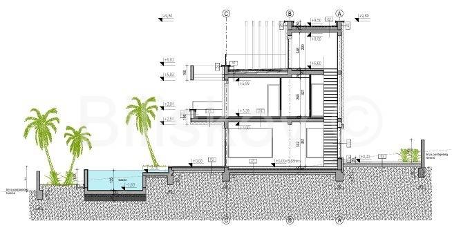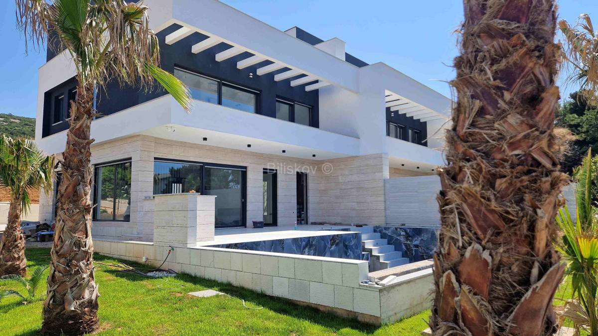 Velike staklene stijene zatvaraju dnevni boravak prema terasi i bazenu, pa se iz dnevnog boravka pruža pogled preko bazena na more. Sa svih etaža prostire se pogled na prekrasno plavo more. Kuća je opremljena visoko kvalitetnom opremom.