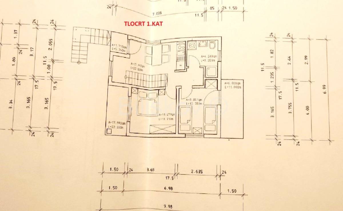 Na katu se nalaze tri sobe, kuhinja, kupaonica te dva balkona.