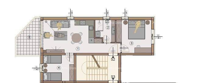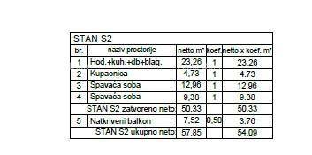 U ponudi je stan S2, smješten na prvom katu Zgrade 6 ima površinu 54,09 m2. Sastoji se od dnevne zone s kuhinjom i blagovaonicom, kupaonice, dvije spavaće sobe i natkrivene terase od 8,03 m². Ugodan, svijetao i funkcionalan.