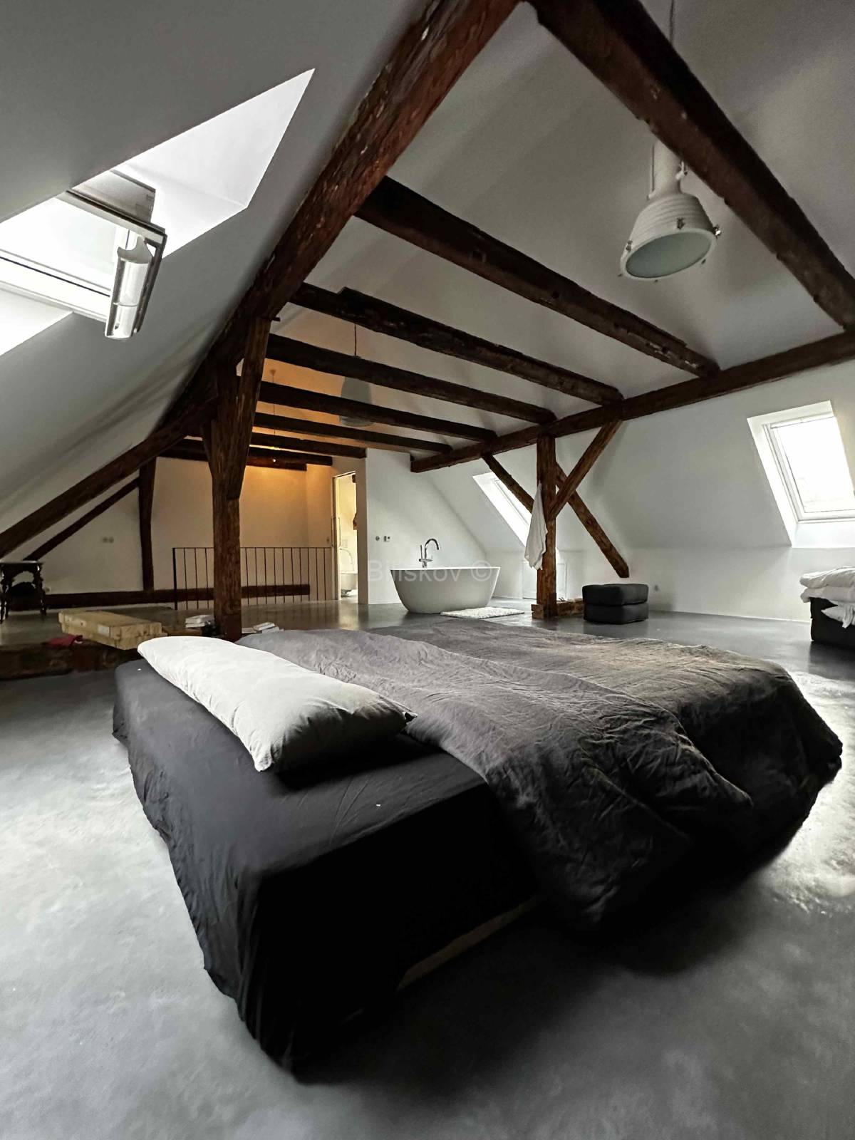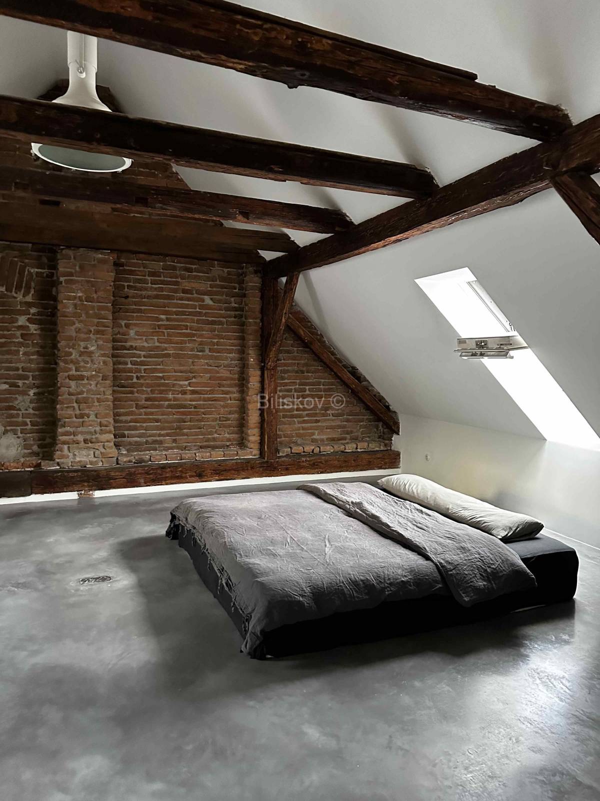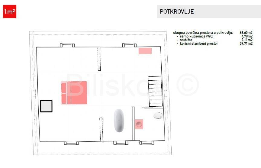 Potkrovlje, površine 66 m², obuhvaća prostranu spavaću sobu, modernu kupaonicu i stubište, stvarajući intiman prostor za opuštanje.