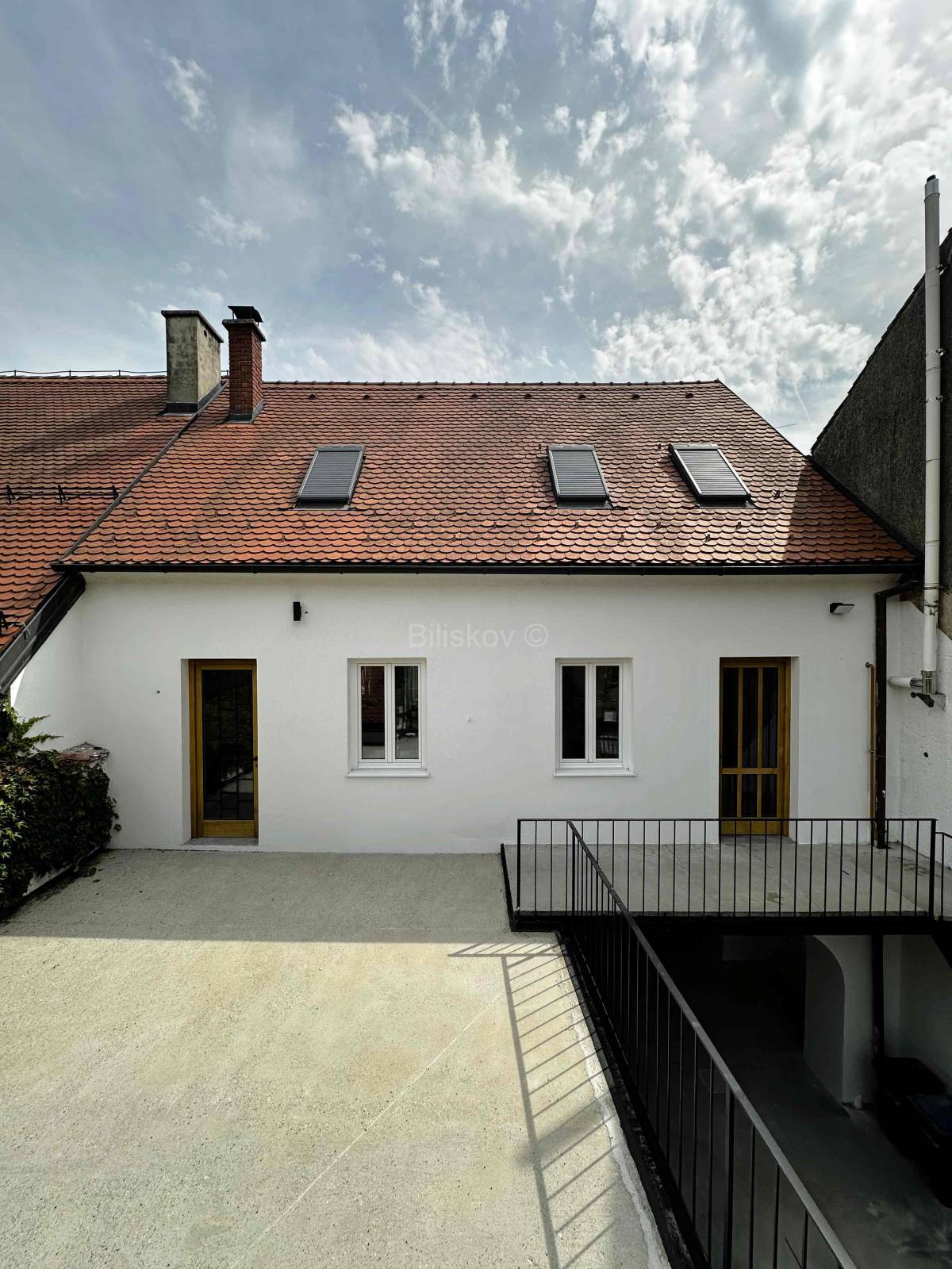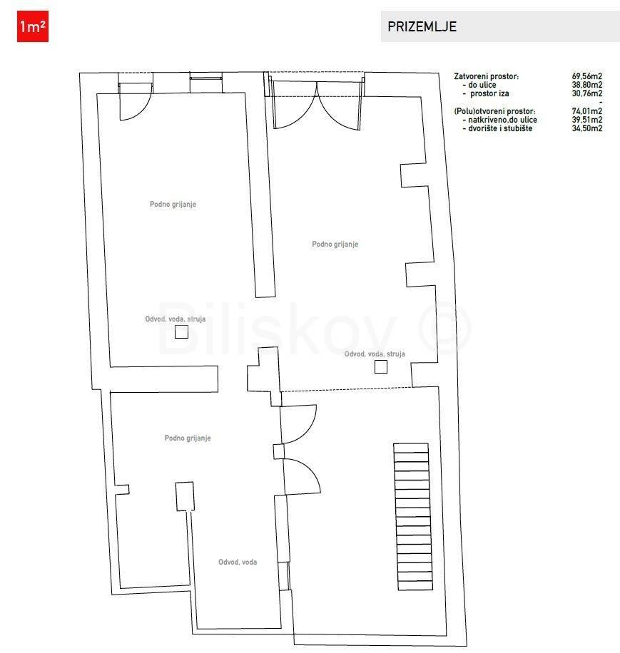 Prizemlje zauzima 143 m², od čega je 70 m² zatvorenog prostora, trenutno raspoređenog u dvije prostorije koje su pripremljene za poslovnu namjenu. Uz mogućnost prenamjene u stambeni prostor, prizemlje također obuhvaća dvorište, prostranu terasu i vanjsko stubište, čineći ovu etažu iznimno fleksibilnom.