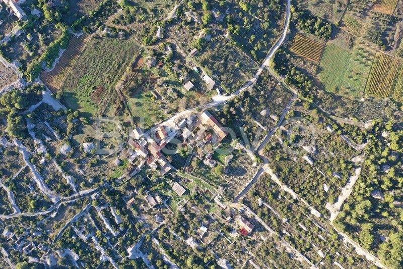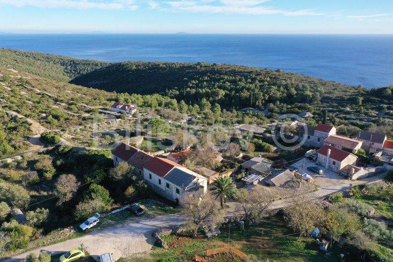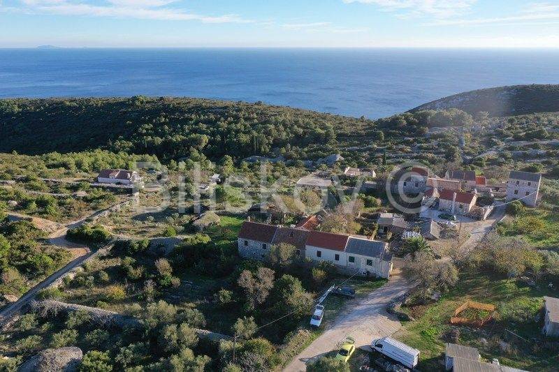 Vis, Komiža, Podhumlje, kamena kuća u nizu površine 67 m2 ( prizemlje + kat ) na parceli površine 103 m2, 3 manja objektića površina 28, 25 i 19 m2 na parceli površine 236 m2 + poljoprivredna zemljišta površine 7098 m2