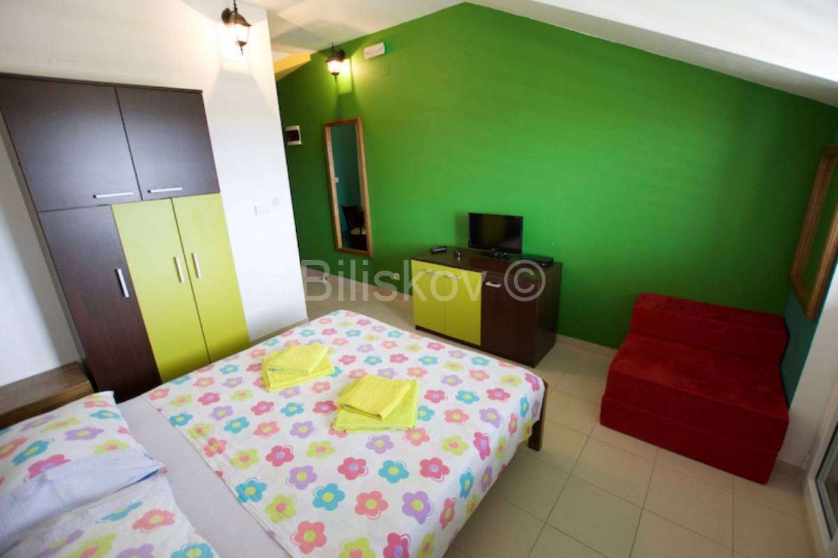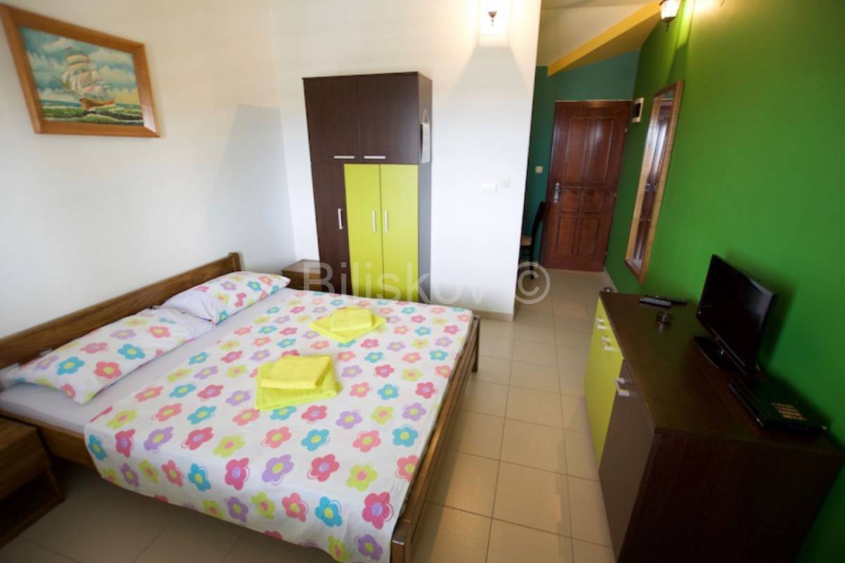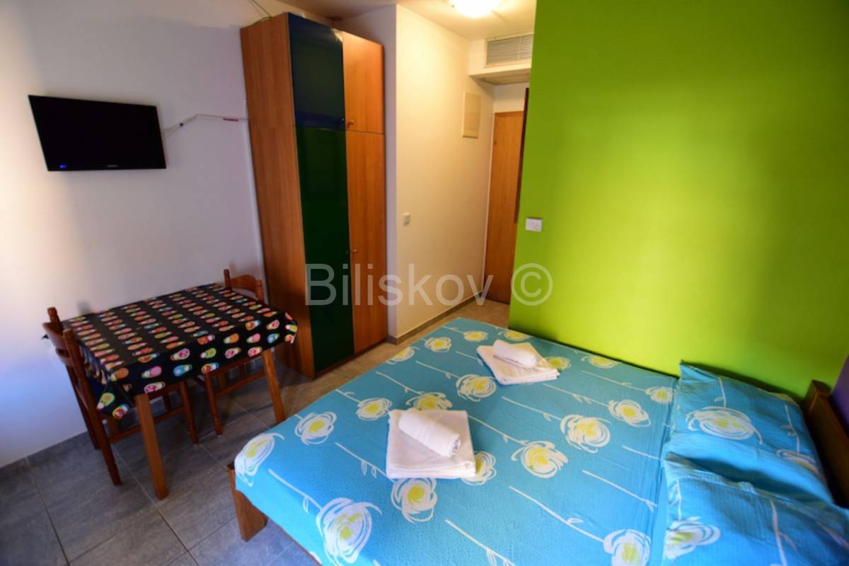 Objekt 1.- izgradnja 2003 god.- 564 m2 BRP- 454 m2 NGP- suteren, prizemlje, kat, visoko potkrovlje- ukupno 17 studio apartmana- u suterenu se nalazi kotlovnica, praonica, skladište, 3 sobe za osoblje, 3 kupaonice s tuš kabinom- kompletno grijanje hlađenje svih prostorija