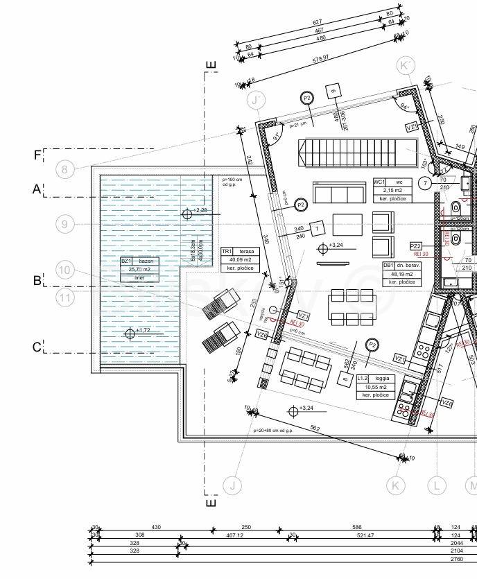 Prizemlje se sastoji od tri spavaće sobe s pripadajućim kupaonicama, loggie i strojarnice za bazen. Unutarnjim stepenicama dolazi se na kat gdje se nalazi prekrasan „open space“ dnevni boravak kuhinja i blagovaonica s izlazom na terasu i pogledom na more na kojoj je smješten bazen (8x3 m). Osim toga, na katu se nalaze gostinjski wc i loggia.