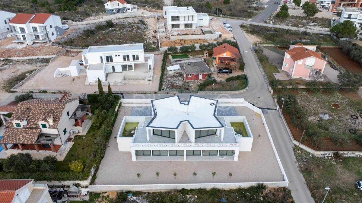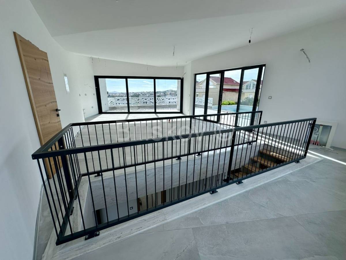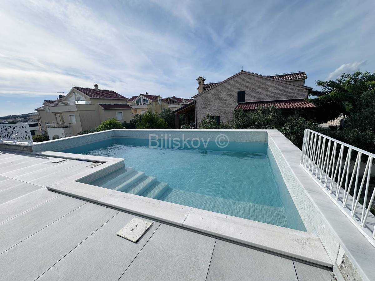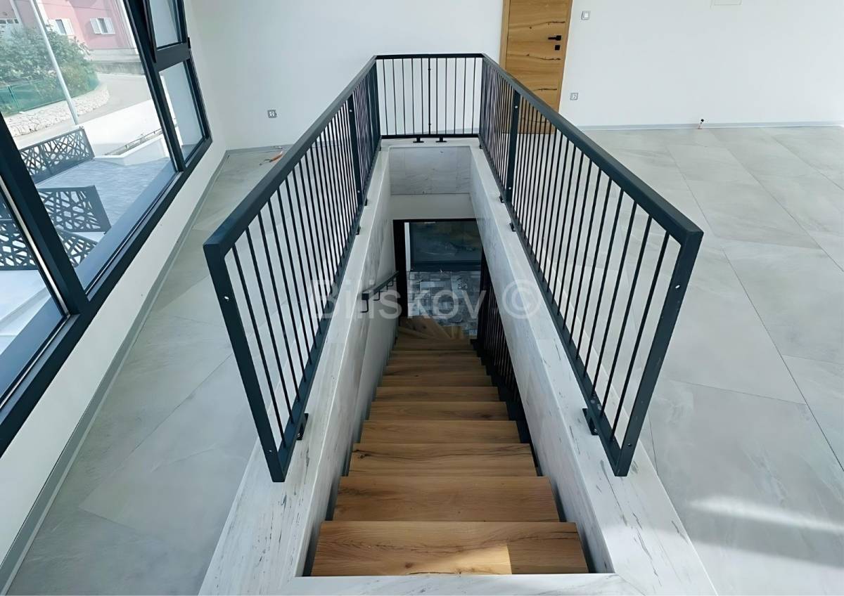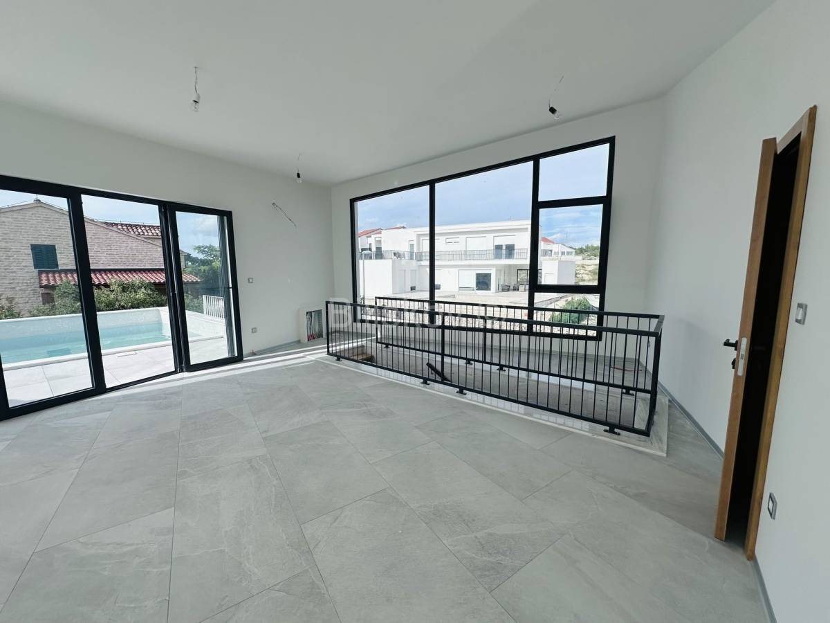 Prizemlje se sastoji od tri spavaće sobe s pripadajućim kupaonicama, loggie i strojarnice za bazen. Unutarnjim stepenicama dolazi se na kat gdje se nalazi prekrasan „open space“ dnevni boravak kuhinja i blagovaonica s izlazom na terasu i pogledom na more na kojoj je smješten bazen (8x3 m). Osim toga, na katu se nalaze gostinjski wc i loggia.