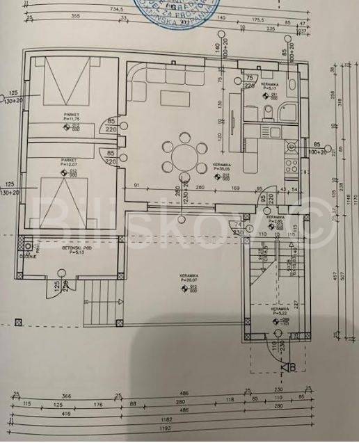 U prizemlju je trosobni stan od 78m2, a sastoji od: dnevnog boravka koji je integriran sa kuhinjom i blagovaonicom, 2 spavaće sobe, kupaonice i terase.