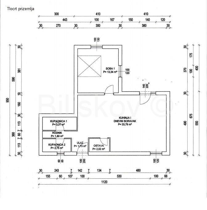 U prizemlju se nalazi dnevni boravak integriran sa kuhinjom i blagovaonicom, spavaća soba, dvije kupaonice i ostava.