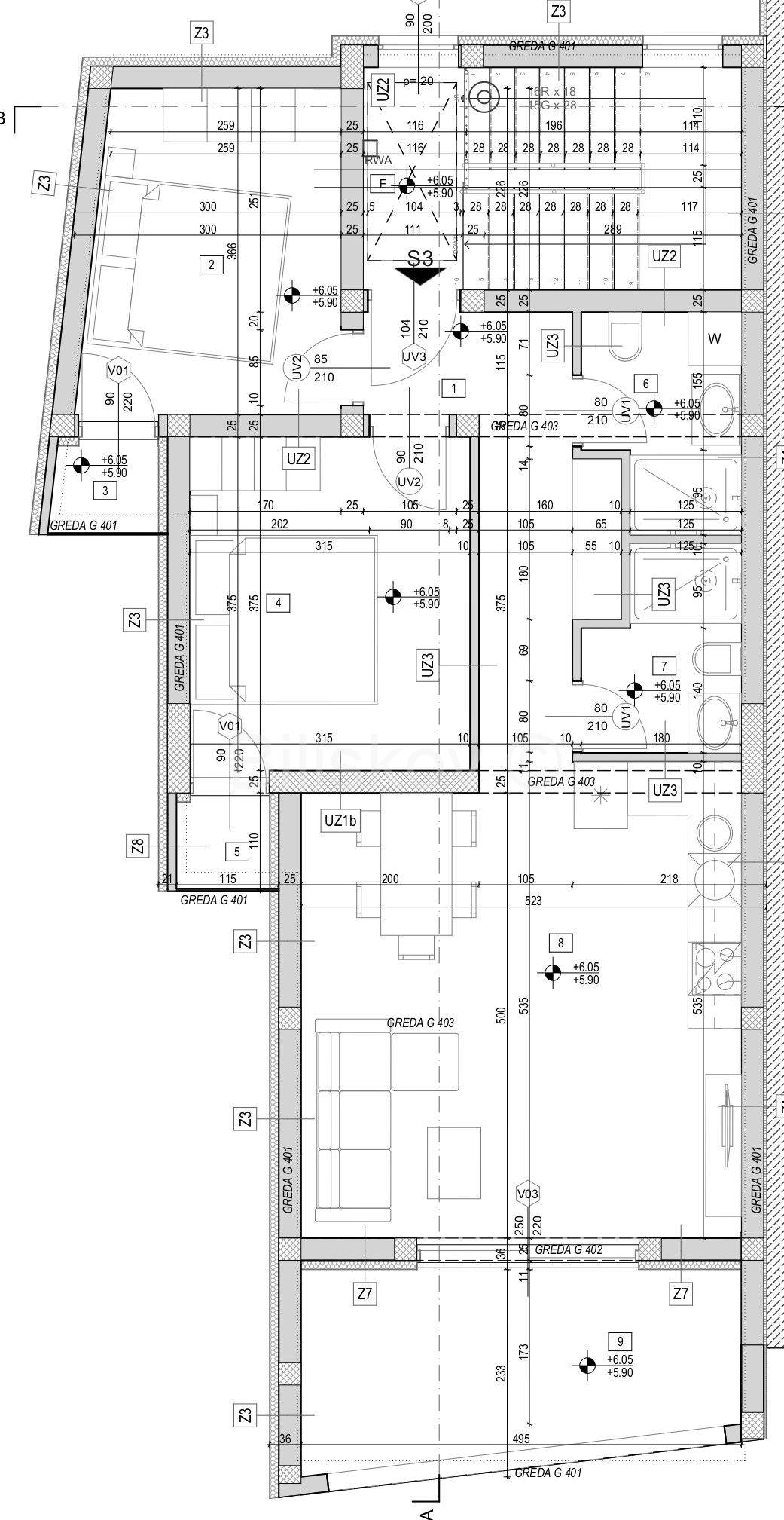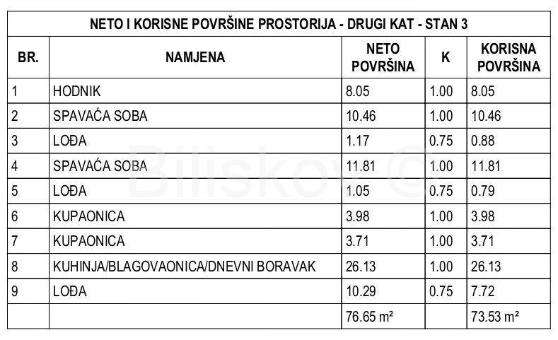 Ovaj dvosobni stan na posljednjem katu zgrade od 3 etaže sastoji se od kuhinje sa blagavaonicom i dnevnim boravkom, 2 spavače sobe, 2 kupaonice, hodnika te 3 loggie.