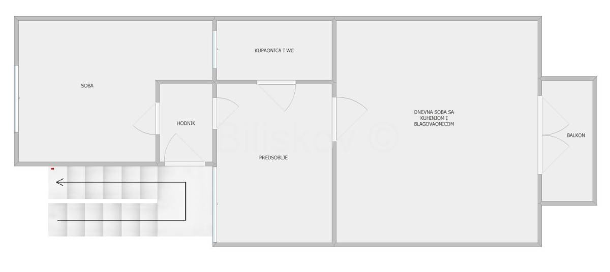 Stan se sastoji od hodnika, predsoblja, jedne sobe, kupaonice s WC-om, balkona te open space dnevnog boravka povezanog s kuhinjom i blagovaonicom.
