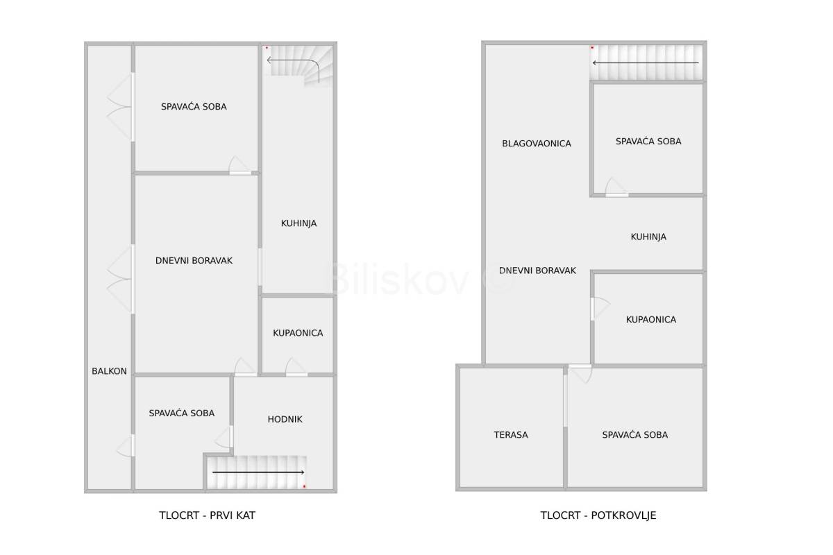 Potkrovlje 68,6 m2: unutarnje stubište, dnevni boravak i blagovaonica, kuhinja, dvije spavaće sobe, kupaonica i terasa.