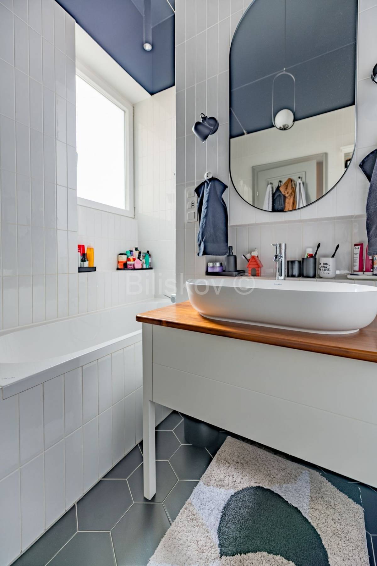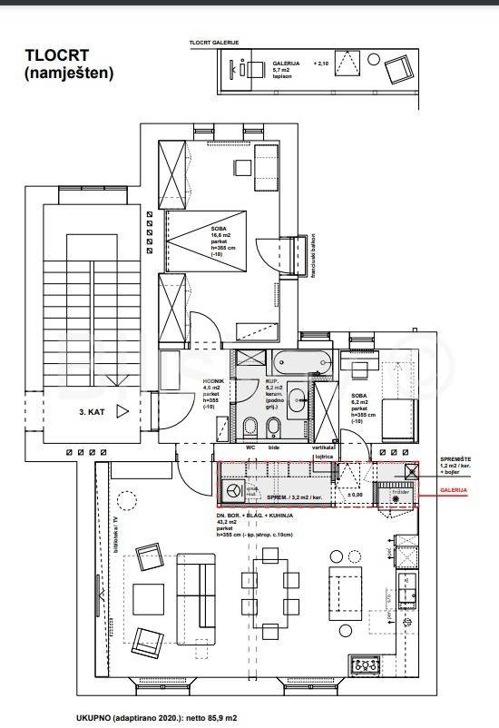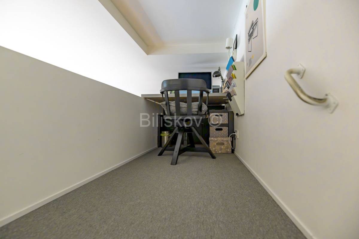 Sastoji se od velikog dnevnog boravka povezanog sa kuhinjom i blagovaonom (otvoreni koncept), velike spavaće sobe, kupaone, manje dječje sobe i uredskog prostora smještenog na galeriji.