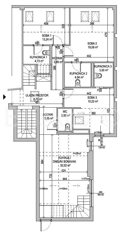 Troetažan stan s 9 soba površine 268,41 m2 na 2. i 3.katu zgrade sagrađene 1920.g.