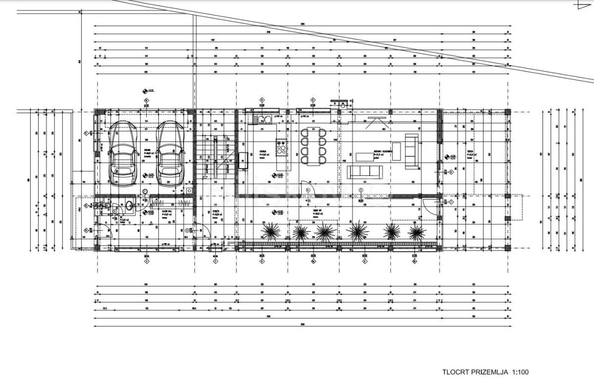 Prizemlje: veliki dnevni boravak integriran s kuhinjom, blagovaonicom i izlazom na terasu i u vrt, gostinjskim wc-om, te garažom za 2 automobila.