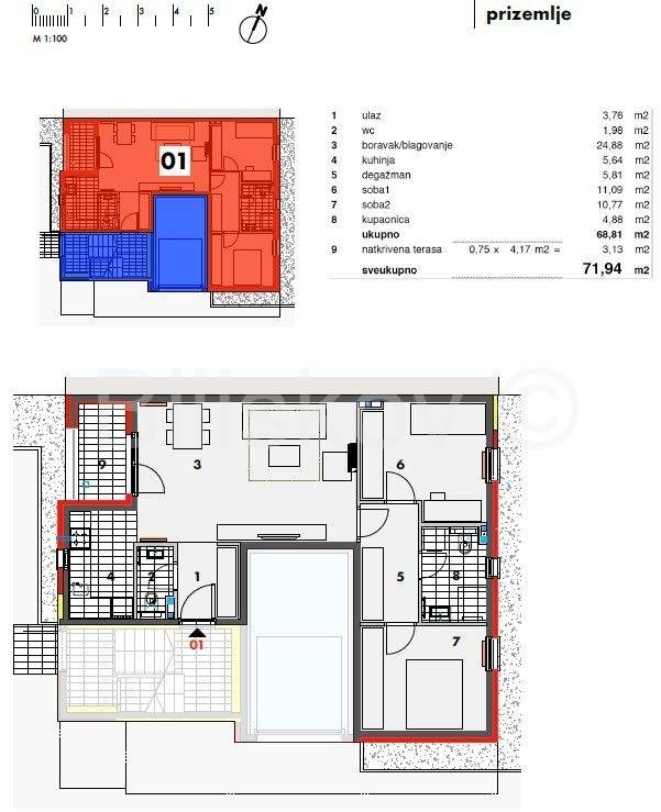 Prozračan i funkcionalan trosoban stan ukupne površine 71,94 m2 u visokom prizemlju zgrade izgrađene 2024. godine.