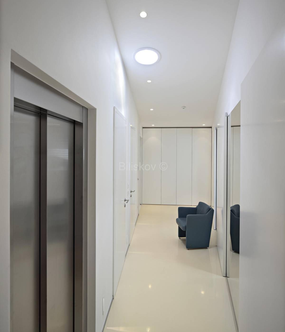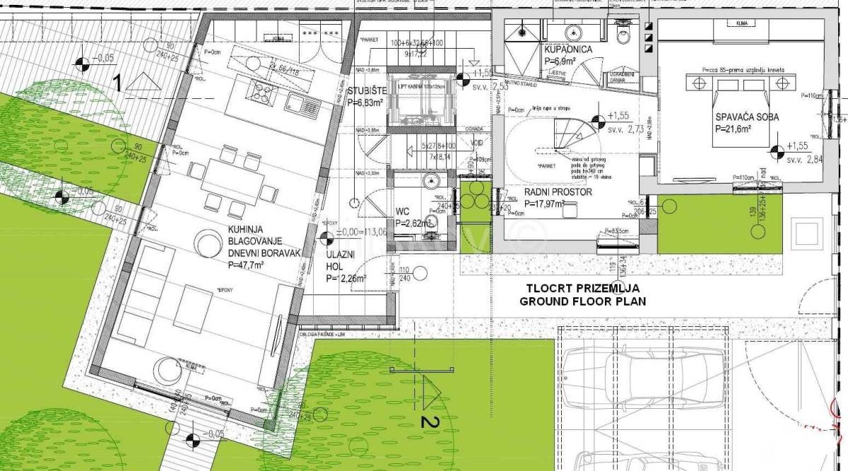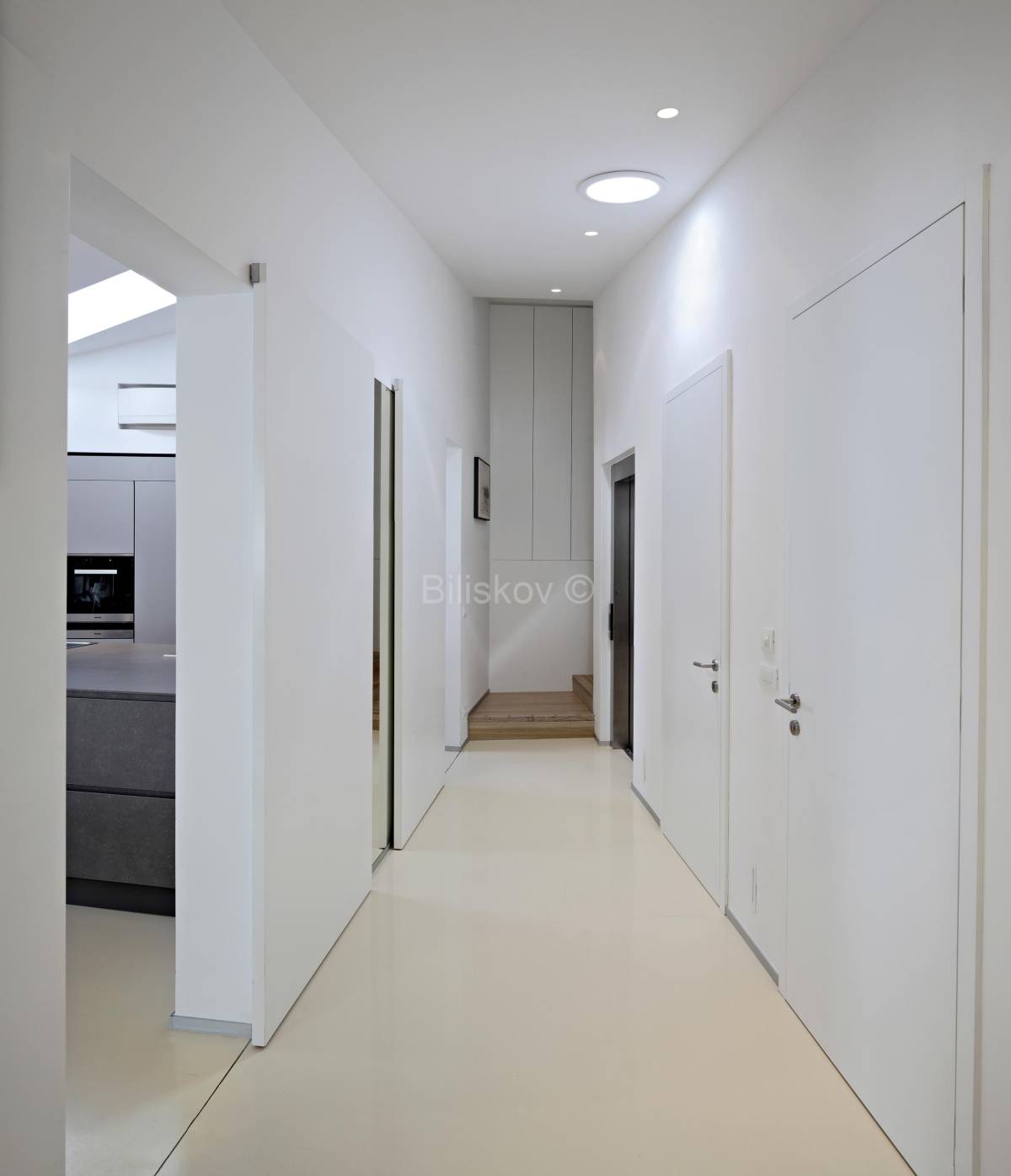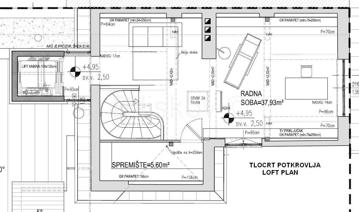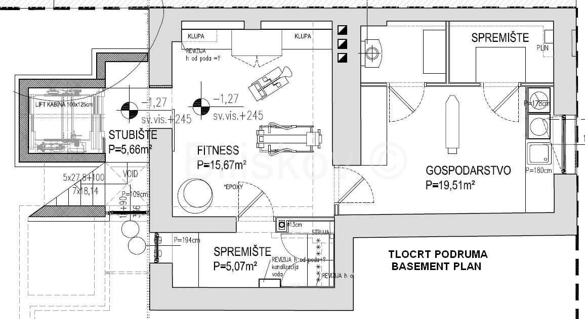 Kuća se prostire na tri etaže povezane liftom i kružnim stepeništem. U suterenu su smješteni fitness prostor, gospodarska prostorija i spremište. Prizemlje čine ulazni hodnik, moderna kupaonica sa wc-om, odvojeni WC, spavaća soba, radni prostor te prostrani open-space dnevni boravak s blagovaonicom i kuhinjom. Potkrovlje je uređeno kao otvoreni multifunkcionalni radni prostor i spremište.