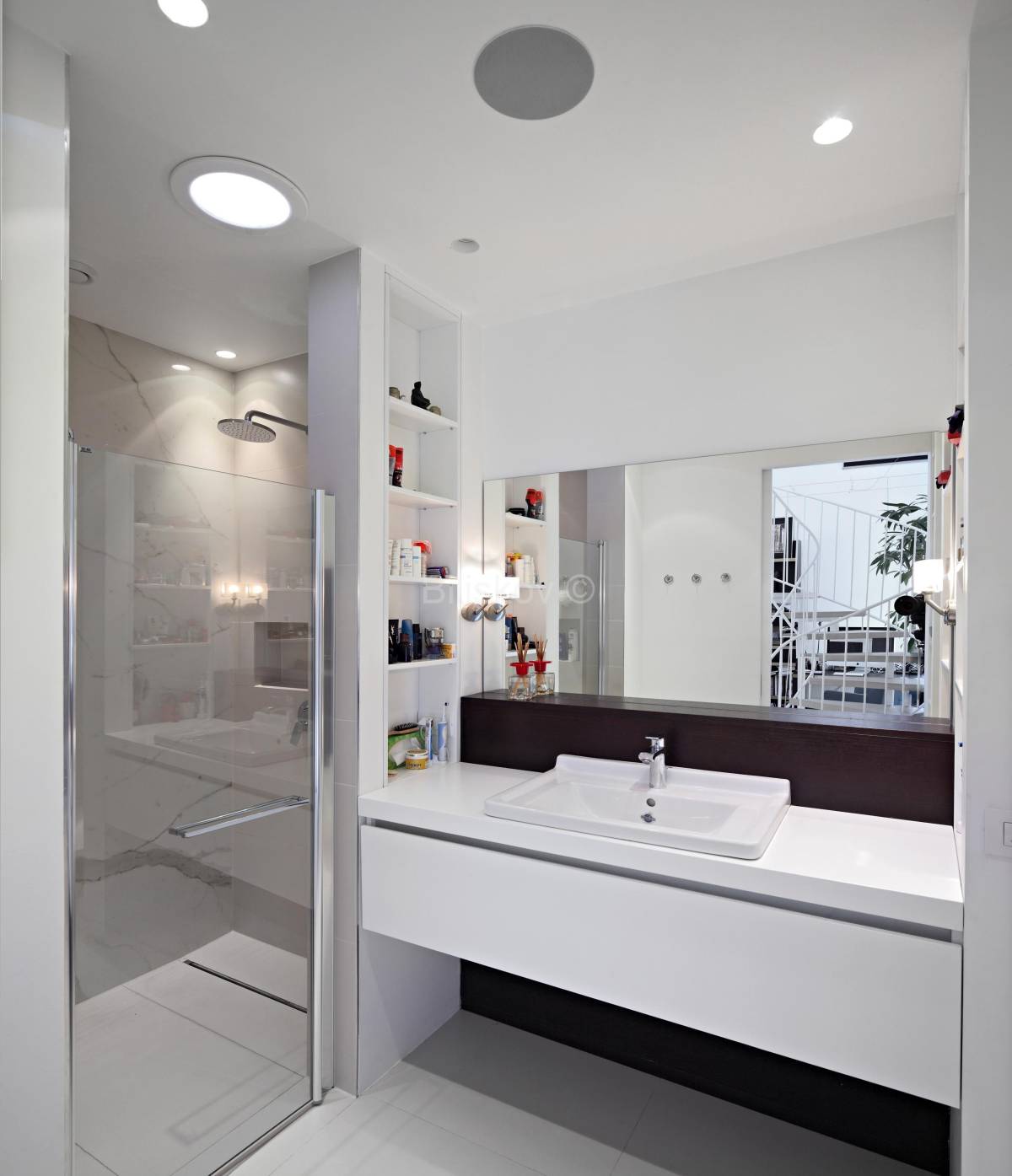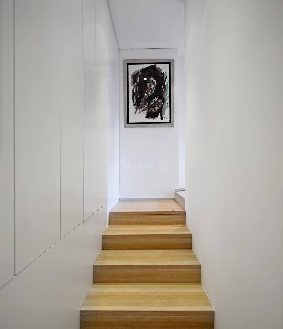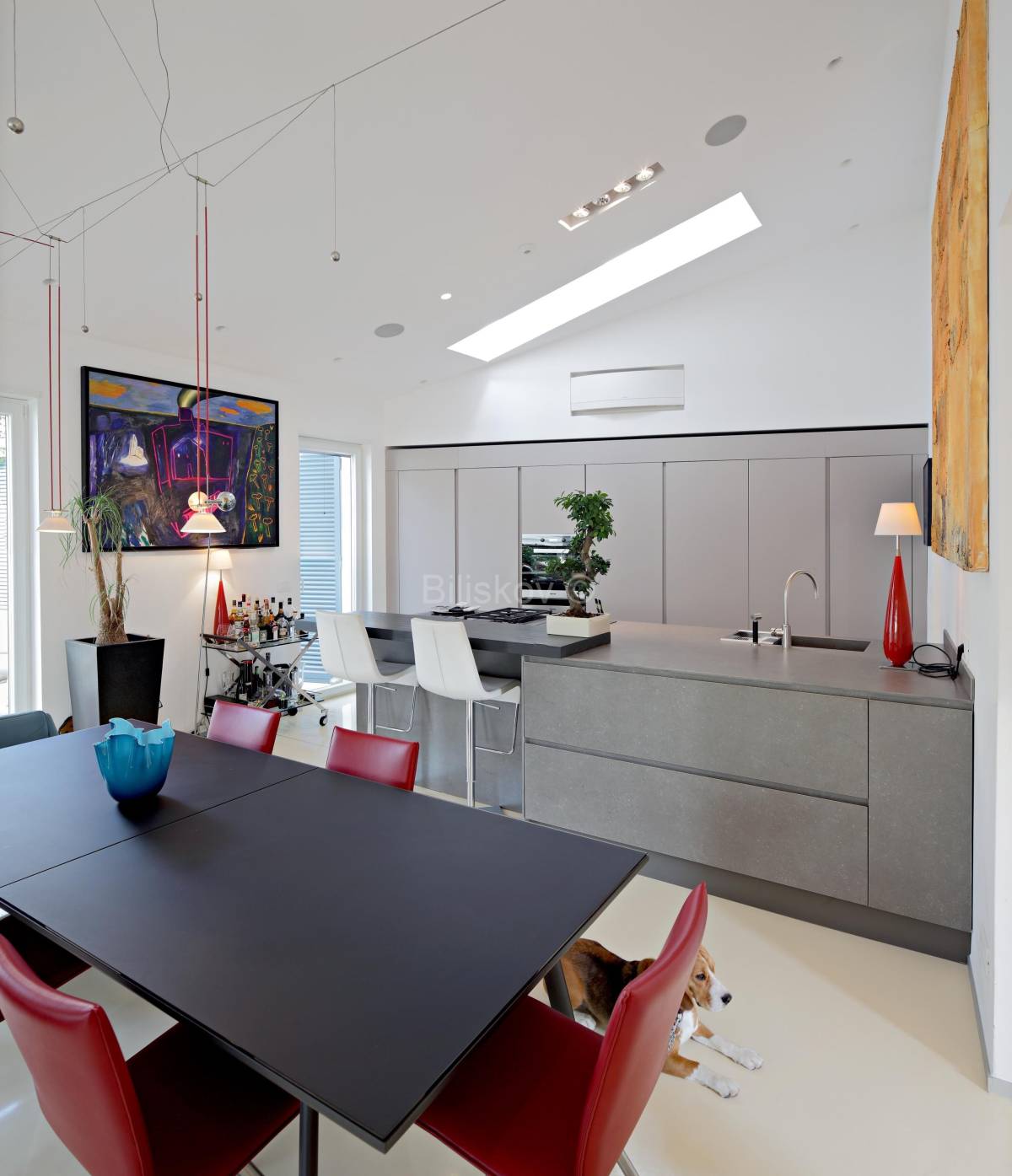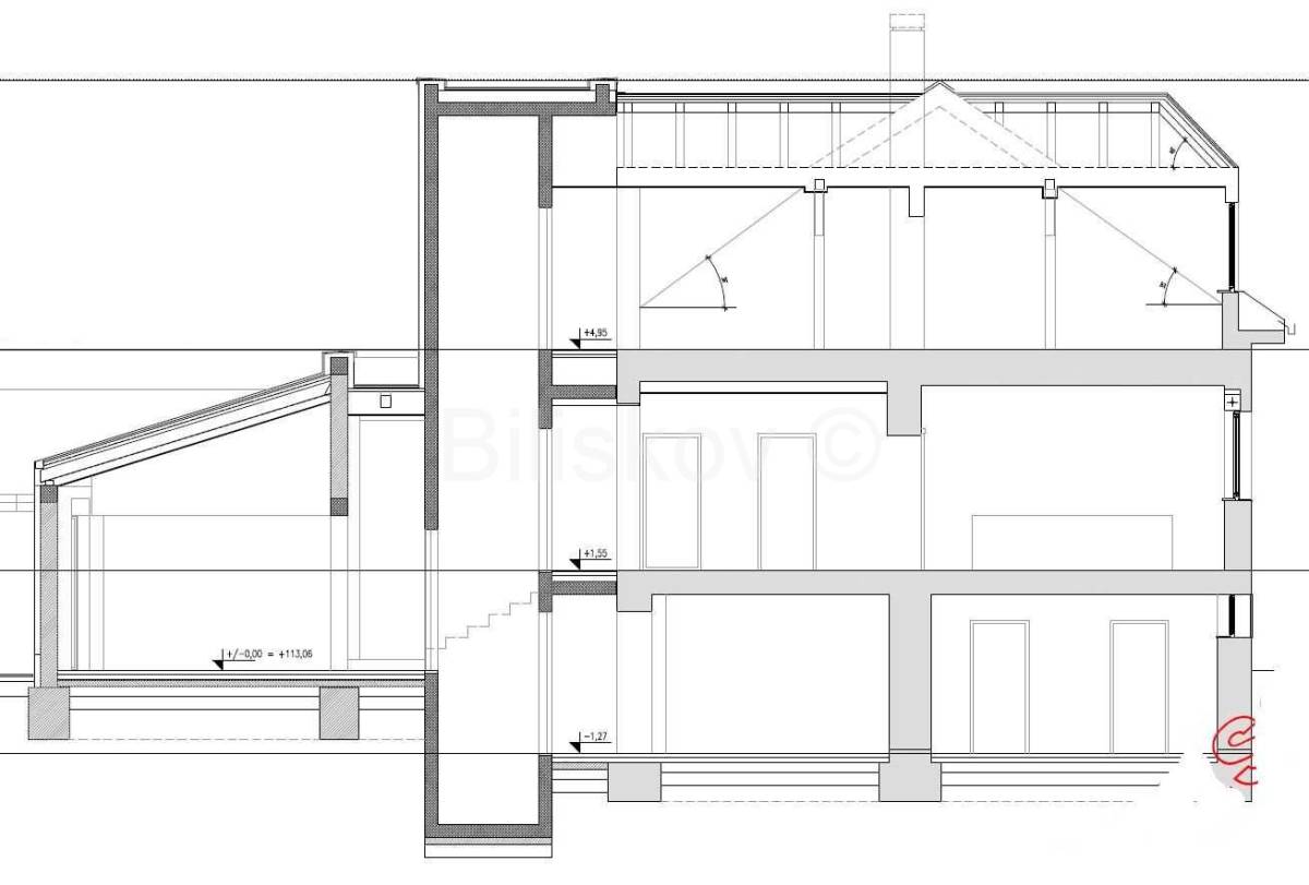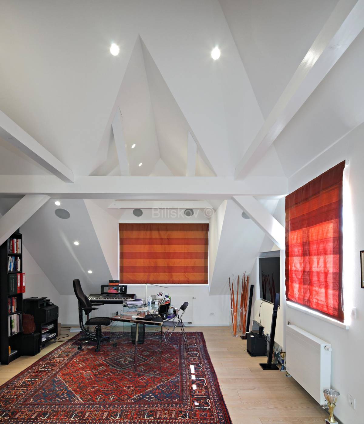 Kuća se prostire na tri etaže povezane liftom i kružnim stepeništem. U suterenu su smješteni fitness prostor, gospodarska prostorija i spremište. Prizemlje čine ulazni hodnik, moderna kupaonica sa wc-om, odvojeni WC, spavaća soba, radni prostor te prostrani open-space dnevni boravak s blagovaonicom i kuhinjom. Potkrovlje je uređeno kao otvoreni multifunkcionalni radni prostor i spremište.