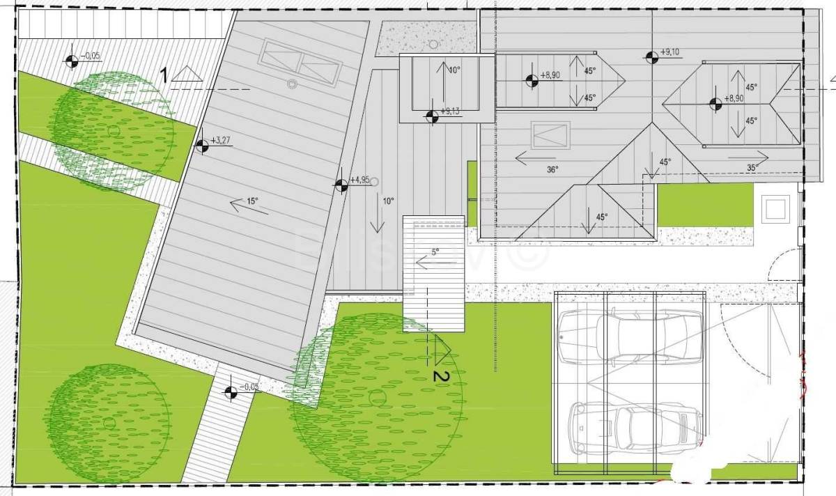 Dvorište ispred kuće sadrži dva natkrivena parkirna mjesta, dok su stražnji dio parcele ukrašene uređene zelene površine, idealne za opuštanje.
