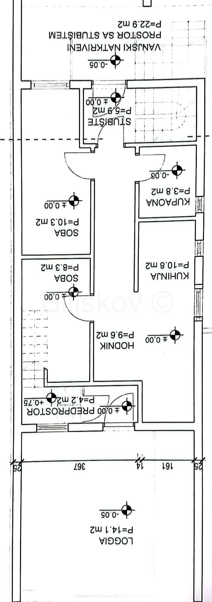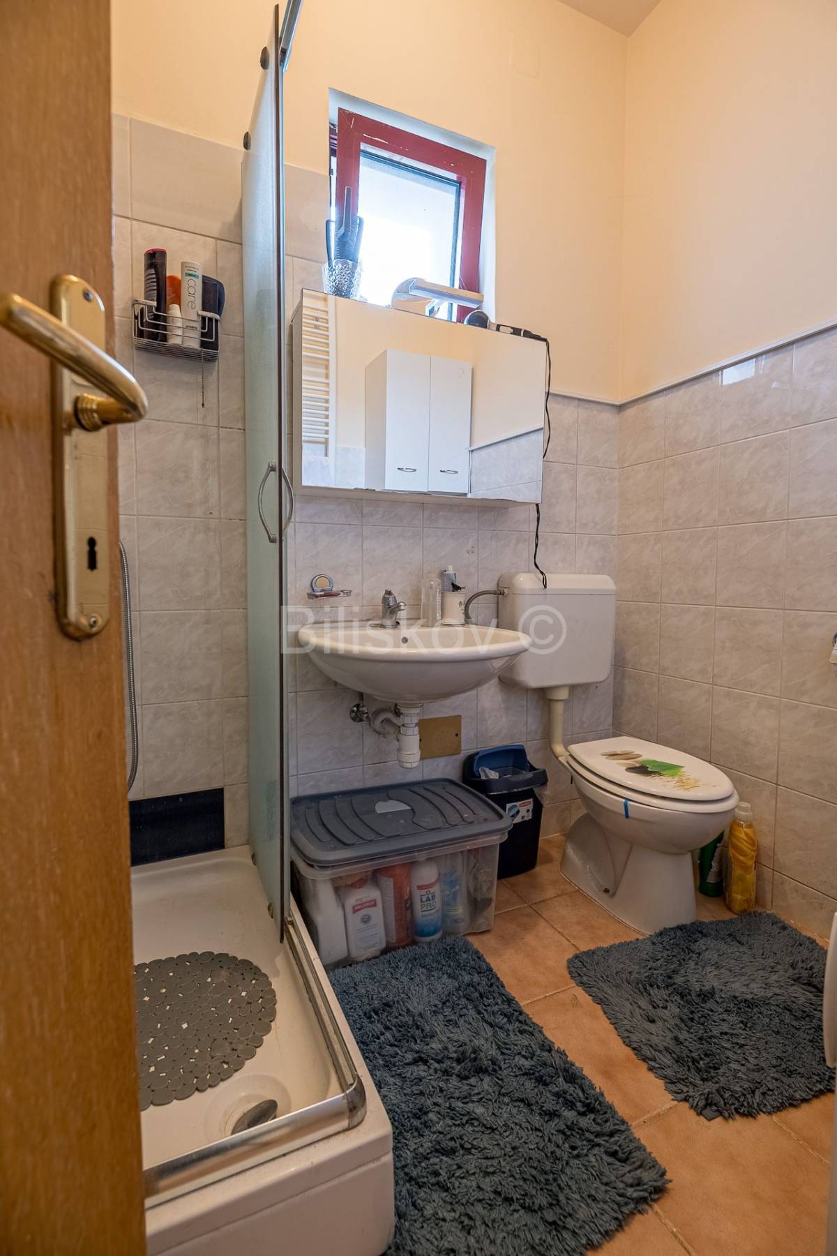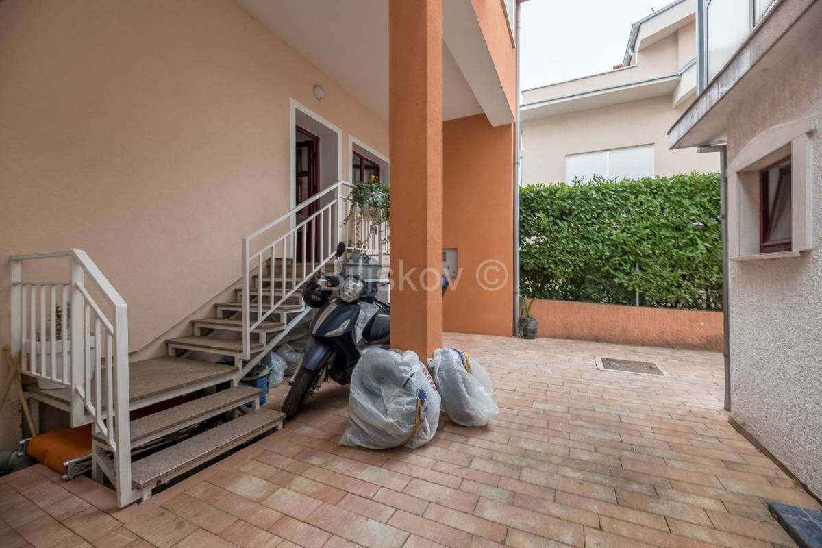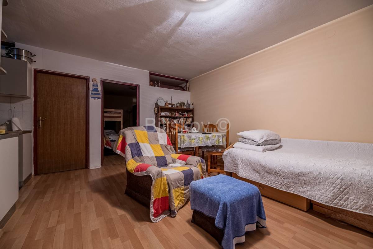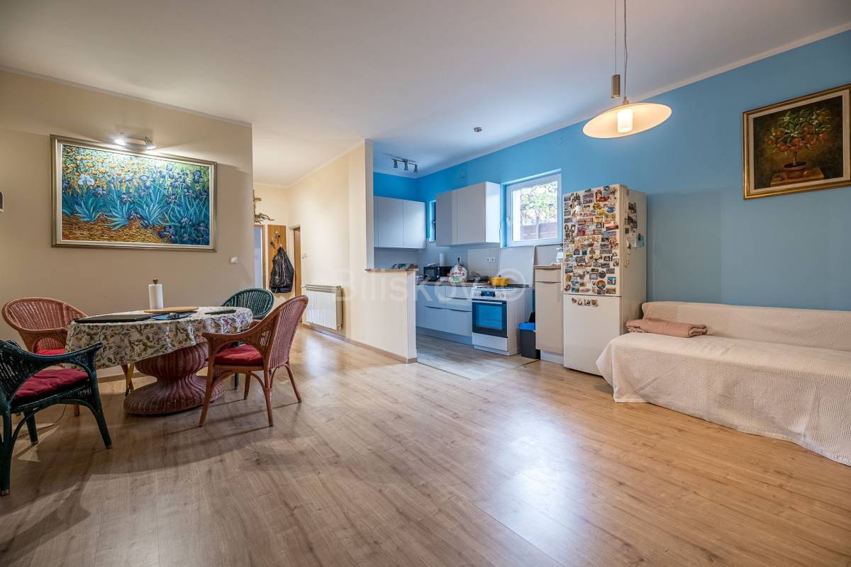Stan u visokom prizemlju se sastoji od velikog dnevnog boravka, blagovaone i kuhinje (otvoreni koncept), kupaone i jedne spavaće sobe te velike loggie.