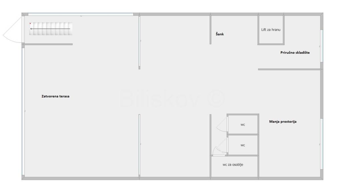 Sastoji se od zatvorene terase površine 40 m2, unutarnjeg dijela lokala površine 59,22 m2 u kojem su muški i ženski wc, veća prostorija, manja prostorija, šank, priručno skladište iza šanka, teretni lift za hranu i piće koji vodi do skladišta u suterenu zgrade površine 28,32 m2. Dio skladišta je preuređen u kuhinju i ima dodatni m/ž wc.