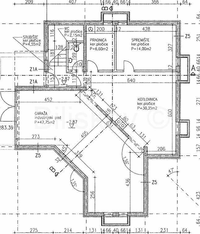 U podrumu se nalazi velika garaža (47,75 m2), kotlovnica (30,35 m2), spremište (14m2), praonica (6,60), wc (2,15), stubišni prostor (4,55m2).